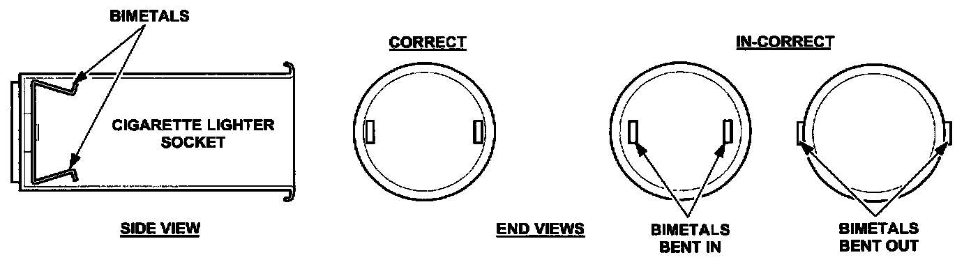 Some customers may state that their cigarette lighter does not work or stay in position. This concern can be caused by the use of an after-market cigarette lighter or a plug adapter of the wrong size for the cigarette lighter socket. As a result, the cigarette lighter socket bimetals can be bent as shown below and/or the socket retainer ring is broken.