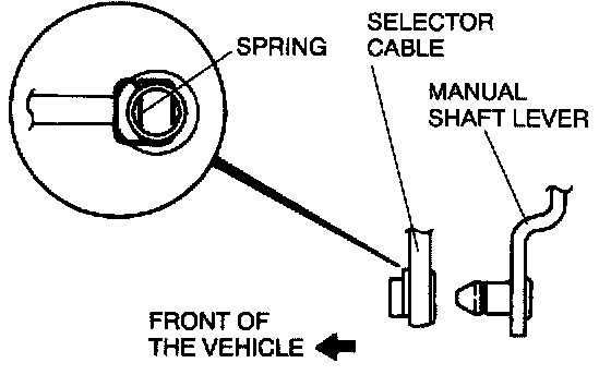 - Install the selector cable to the manual shaft lever with the spring side of the selector cable end facing the front of the vehicle.