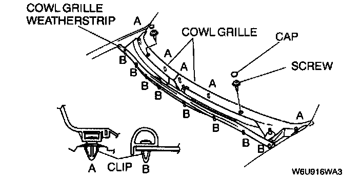 2. Pull the cowl grille weatherstrip to disengage clips B from the body.