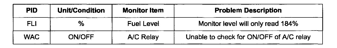 ^ The FLI PID on these vehicles will always indicate 184% regardless of fuel level and the WAG PID will not correctly indicate A/C relay condition. THIS DOES NOT REQUIRE PCM REPLACEMENT. This condition relates to retrieval of diagnostic information only and does not affect vehicle performance or cause a MIL or DTC to be set.