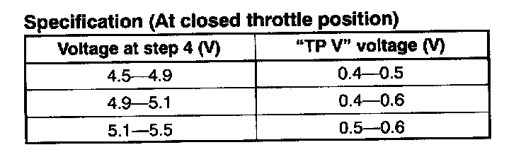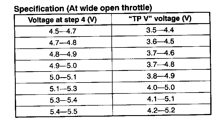 7. When the throttle valve is at the wide open throttle, verify that the "TP V" voltage is in the specification.