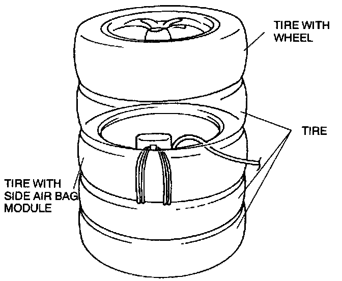 5. Stack the tire with the side air bag module on top of two tires. Stack a tire on top of three tires. Stack another tire that has a wheel on top of the four tires.