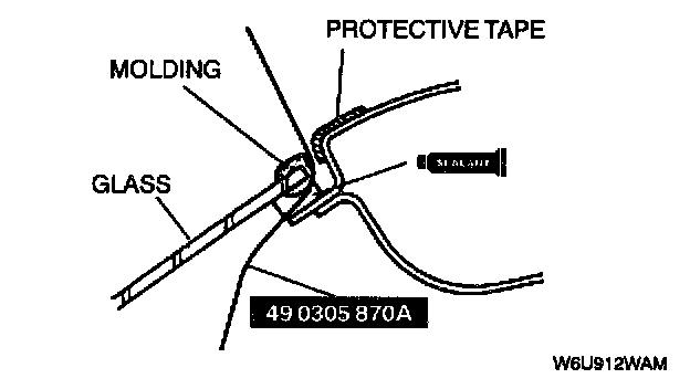 9. Once the primer is dry, apply sealant around the entire circumference to fill the gap between the dam and the edge of the molding with a 11 - 13 mm {0.44 - 0.51 in} high 5 mm {0.2 in} wide bead of sealant. Apply sealant beside the molding.