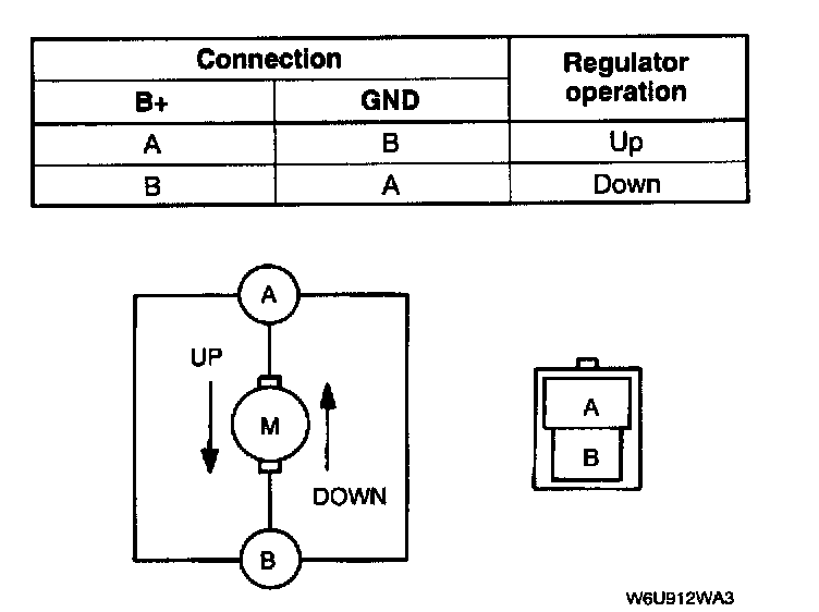 5. Apply battery positive voltage to the front power window regulator terminals and check the operation of the front power window regulator.