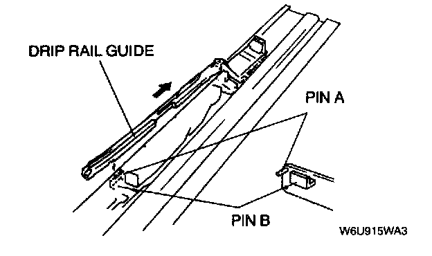 4. Pull the drip rail guide upward to disengage pins A and B from the guide.