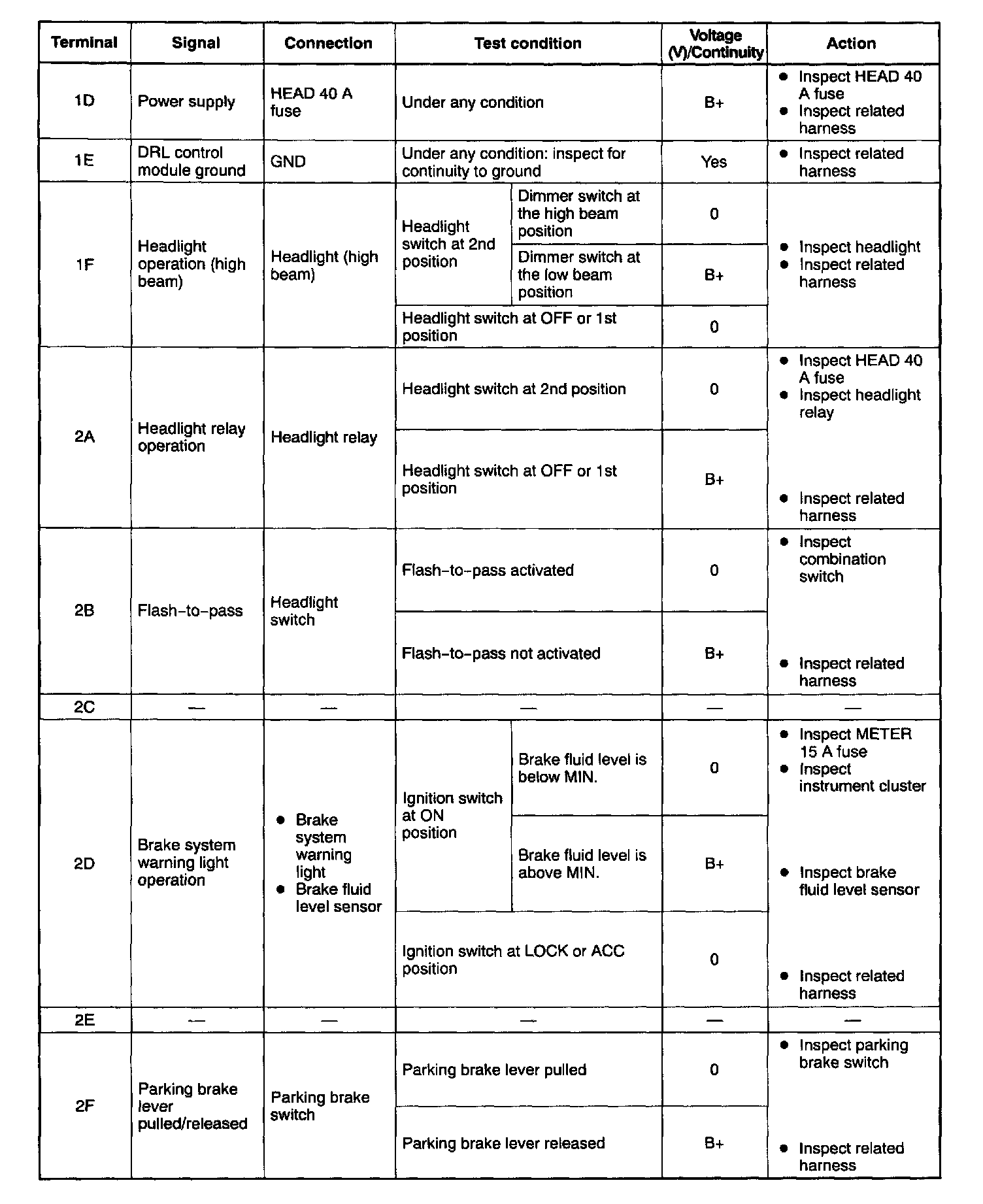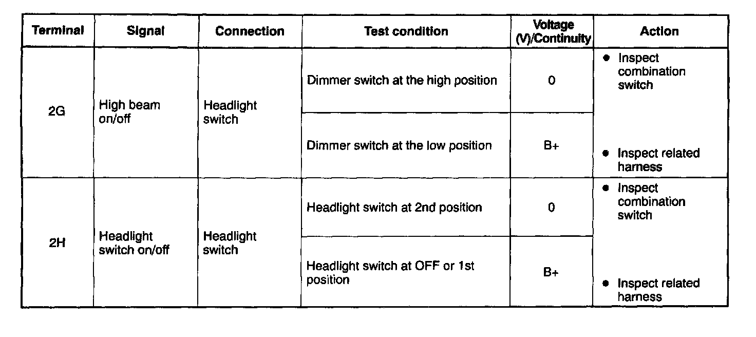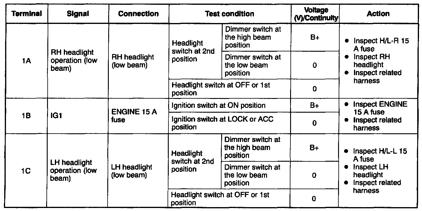 - If not as specified, inspect the parts listed under "Action" and the related wiring harnesses.