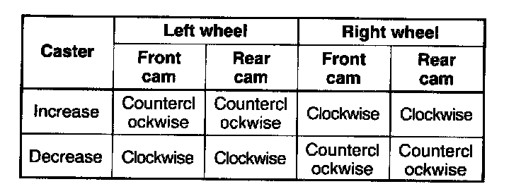 ^ Turning the front cam one graduation changes the camber about 29' and the caster about 25'. Turning the rear cam one graduation changes the camber about 2' and the caster about 25'.