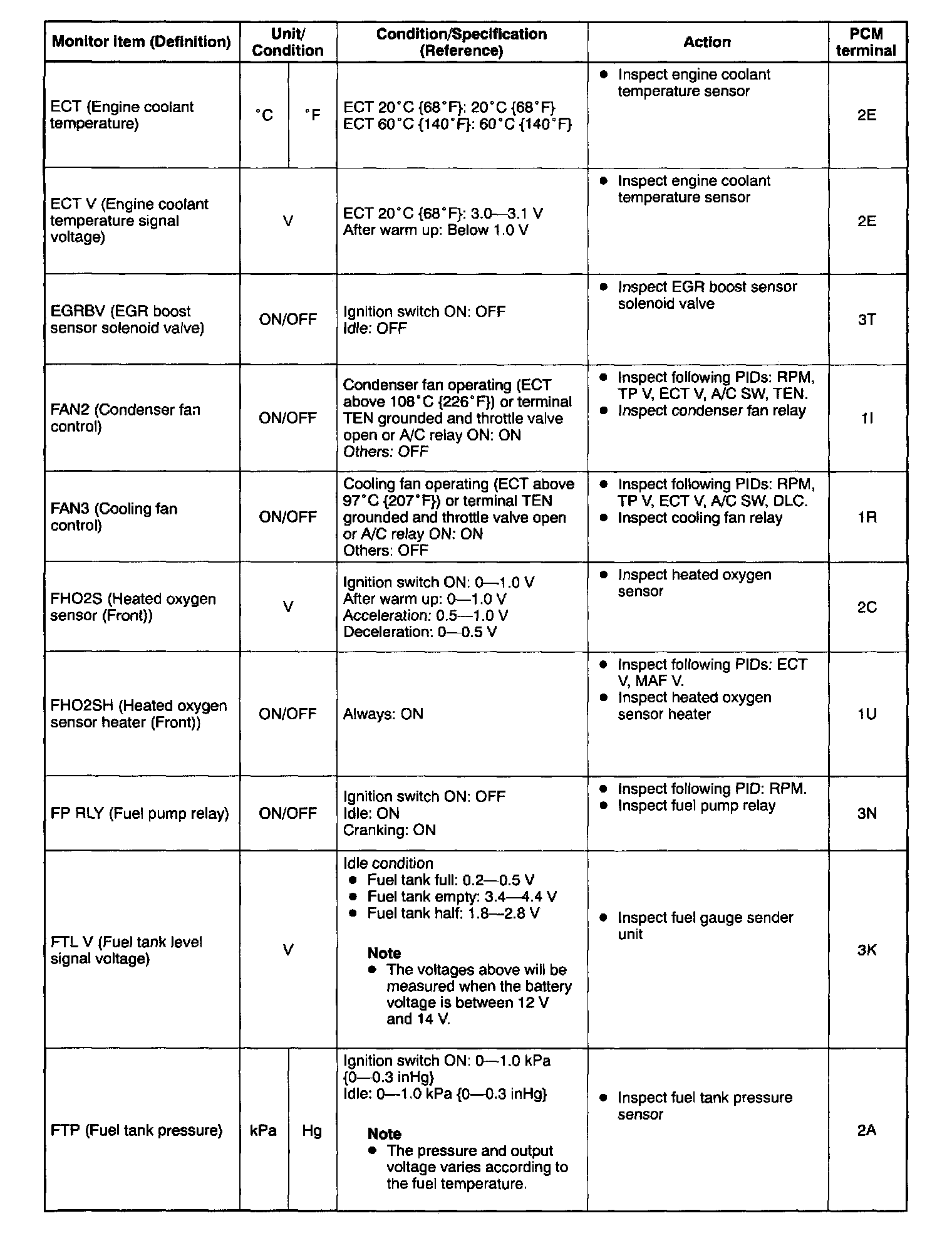 2. Confirm that the following PIDs are within the specifications: