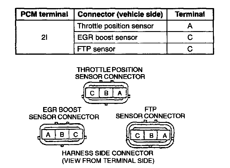 4. Inspect for continuity between the PCM connector (vehicle side) terminal 21 and each sensor connector (vehicle side) terminals to which Vref is applied using an ohmmeter.