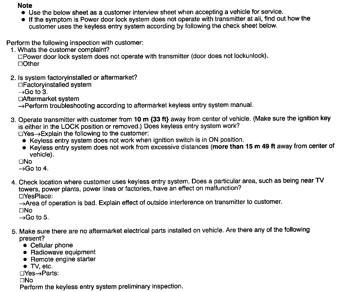 Keyless Entry System Check Sheet: