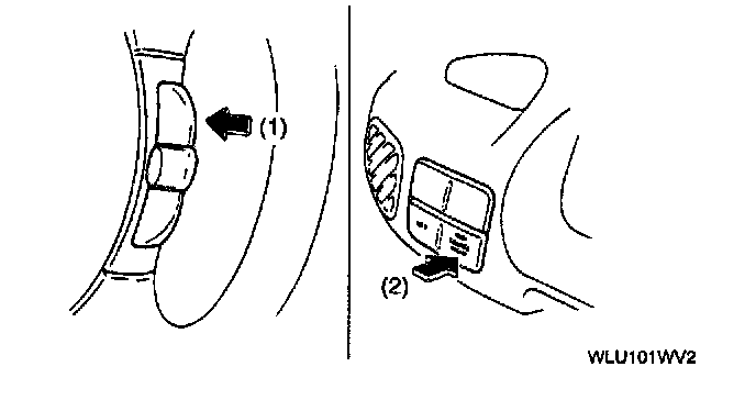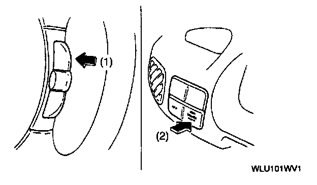 3. Push and hold the RESUME/ACCEL switch (1) then push the cruise control main switch (2) to activate system inspection. (The cruise set indicator light will illuminate for 3 seconds.)