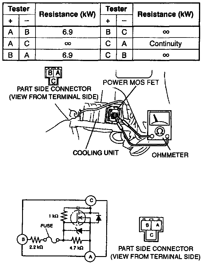 Verify that the resistance between the terminals of the power MOS FET connector (male) is as shown.