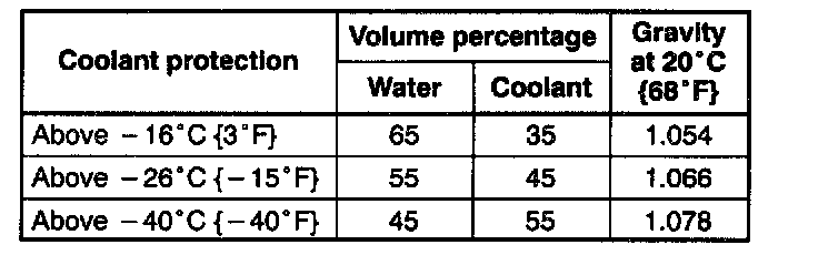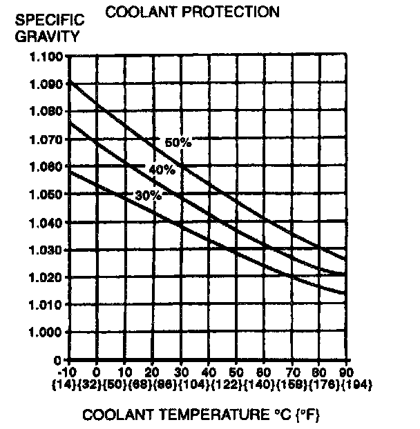 2. Determine the coolant protection by referring to the graph shown. If the coolant protection is not proper, add water or coolant as necessary.