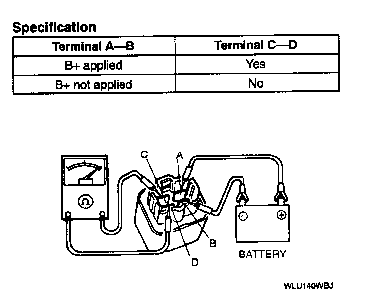 Apply B+ and inspect continuity between terminals of the