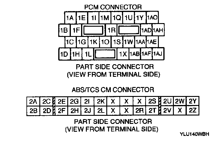 1. Disconnect the PCM connector and ABS/TCS CM connector.2. Verify the continuity between PCM connector terminal 1Q and ABS/TCS CM connector terminal 2S.