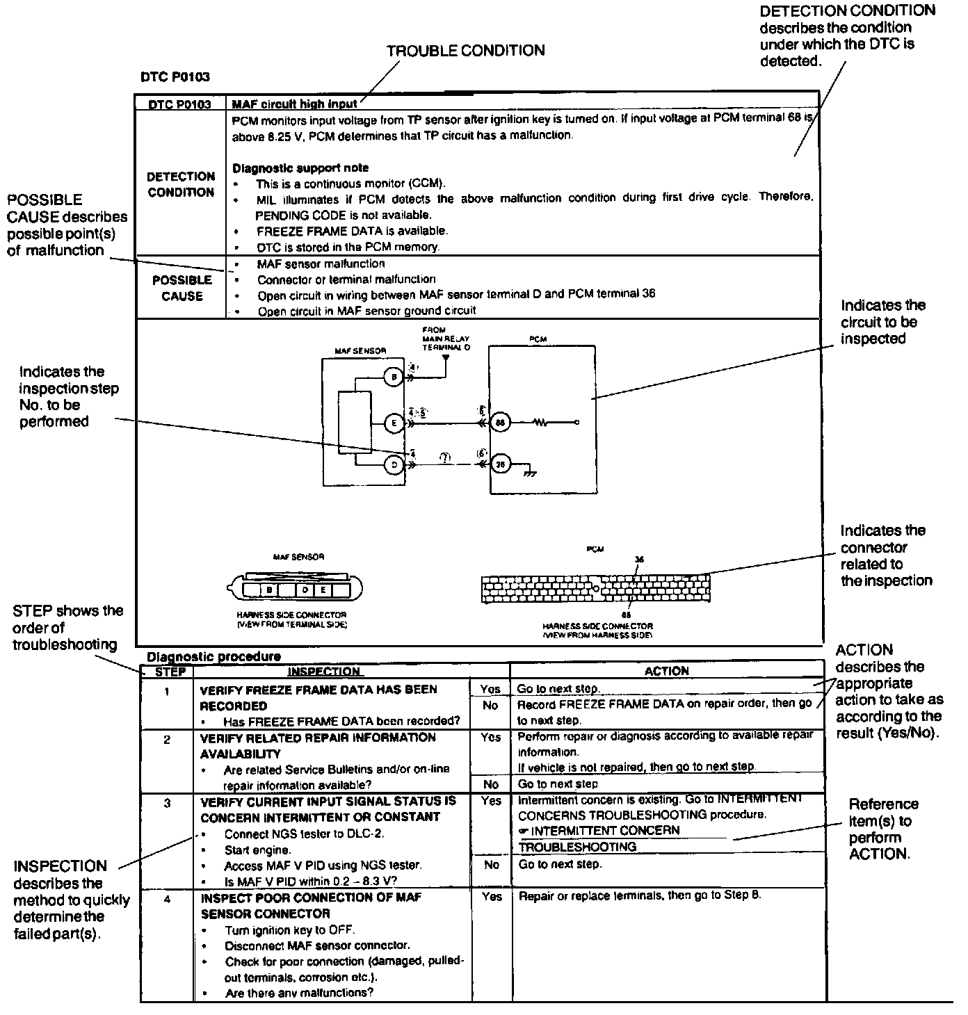 DTC troubleshooting flow shows diagnostic procedures inspection methods, and proper action to take for each DTC.