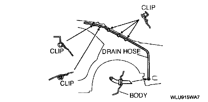 1. Insert one end of the hose into the sunroof frame. Insert the other end into the rear fender panel hole via the hole in the upper part of the C-pillar.