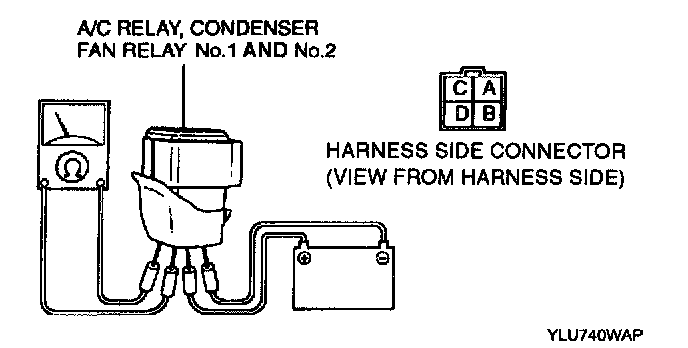 1. Remove the relay.2. Inspect for no continuity between terminals C and D of the relay connector (male).