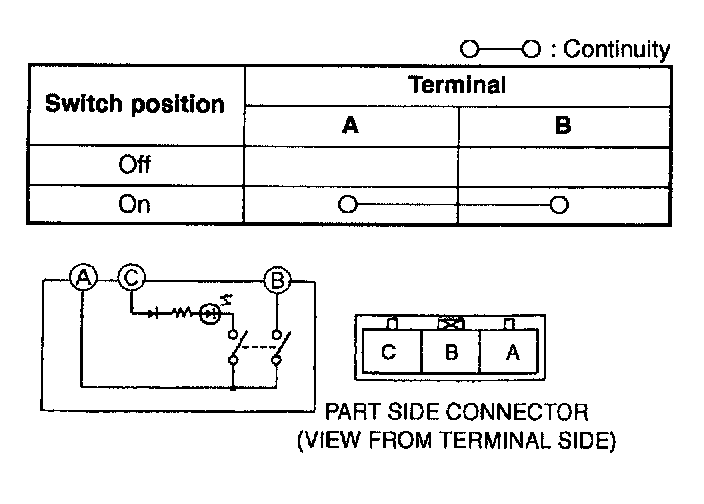 2. Inspect for continuity between the A/C switch terminals using an ohmmeter.