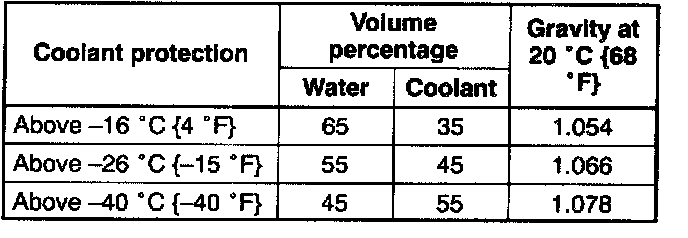 7. Referring to the chart, select proper volume percentage of the water and coolant. Slowly pour the coolant into the radiator up to the coolant filler port.