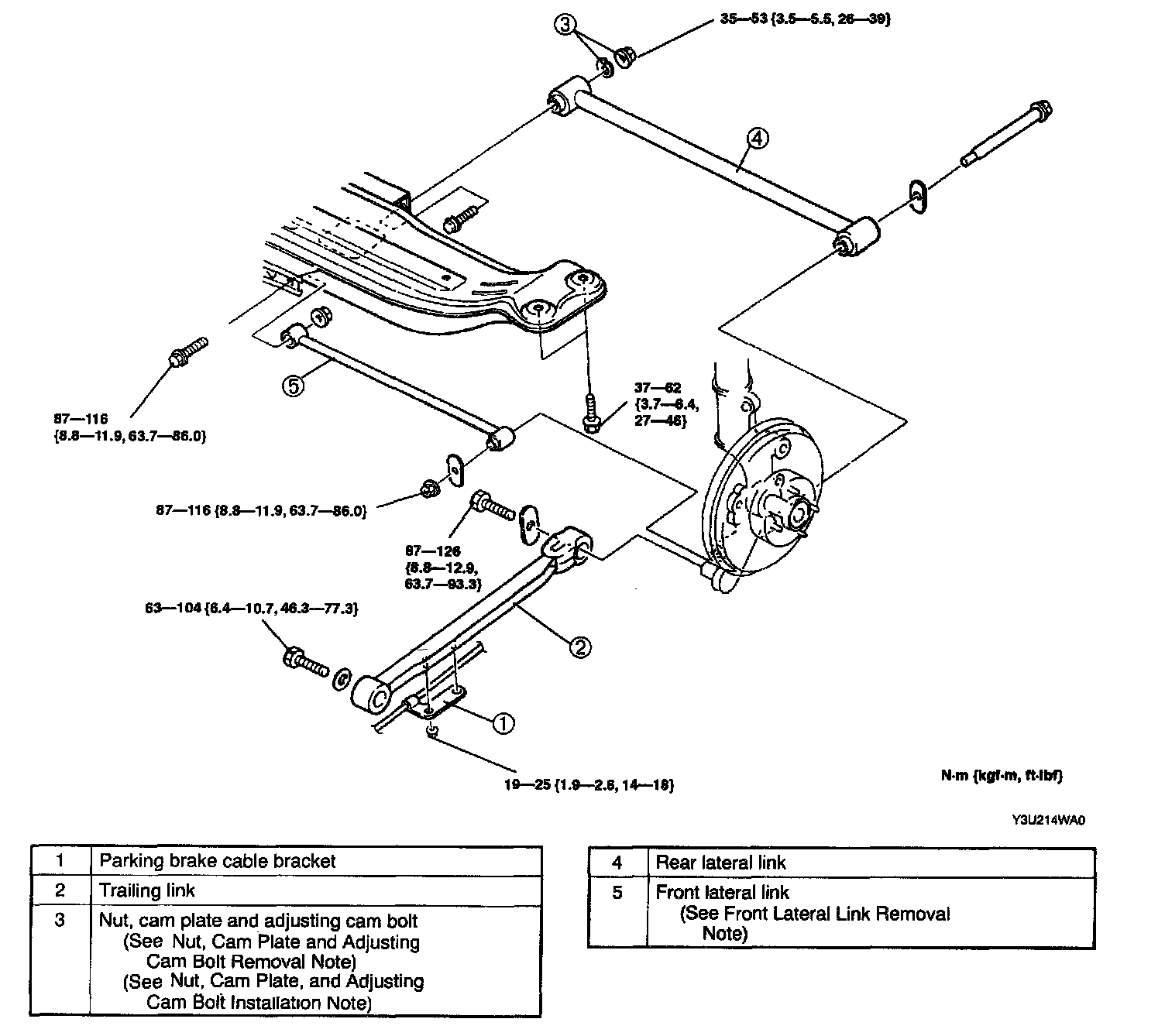 LATERAL LINK AND TRAILING LINK REMOVAL/INSTALLATIONCaution Performing the following procedures without first removing the ABS wheel-speed sensor may possibly cause an open circuit in the harness if it is pulled by mistake. Before performing the following procedures, remove the ABS wheel-speed sensor (axle side) and fix it to an appropriate place where the sensor will not be pulled by mistake while servicing the vehicle.