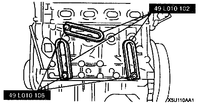 2. Install the SST (arms) to the cylinder block holes as shown, and hand-tighten the SST (bolts),