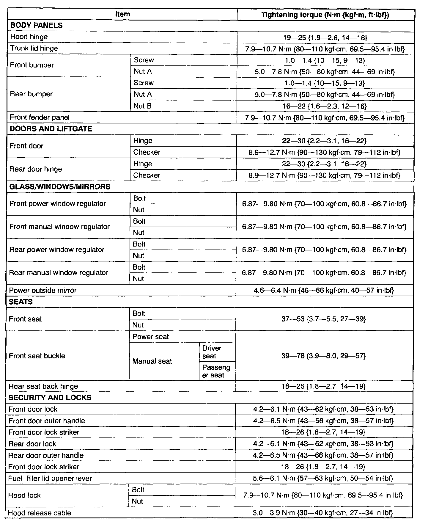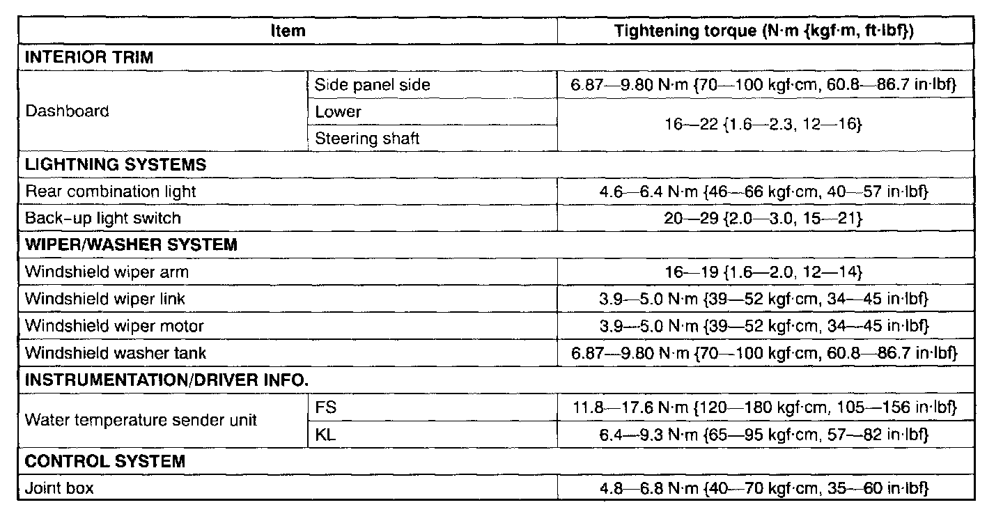 Body & Accessories Tightening Torque Part 1: