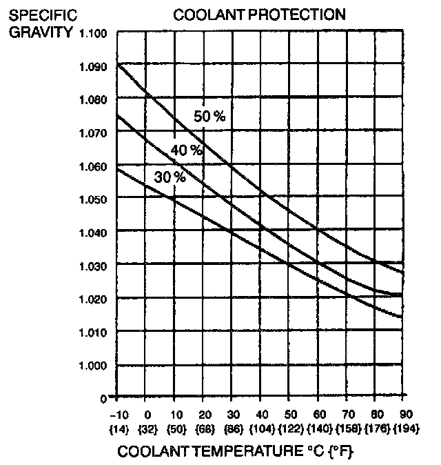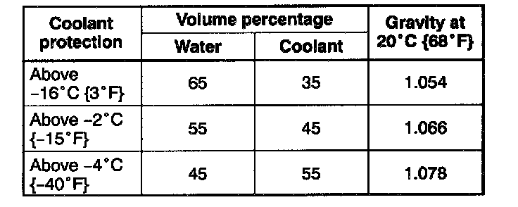 7. Referring to the following graph and chart, select proper gravity of the coolant. Slowly pour the coolant into the radiator up to the coolant filler port (FS) or into the engine up to the coolant filler port (KL).