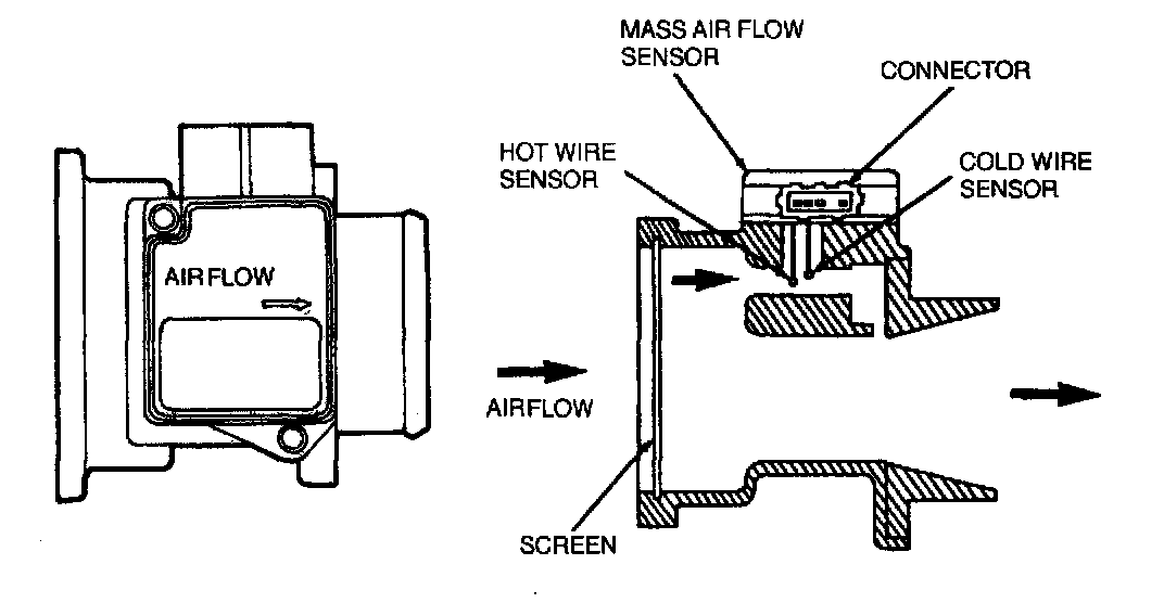 - The mass air flow (MAF) sensor uses a hot wire to measure the amount of mass air intake flow.
