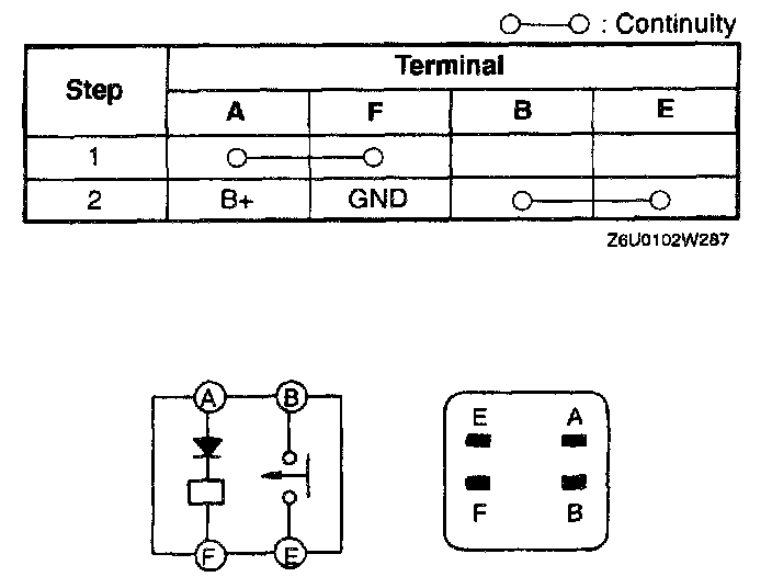 2. Apply battery positive voltage and check continuity between terminals of the main relay by using an ohmmeter.