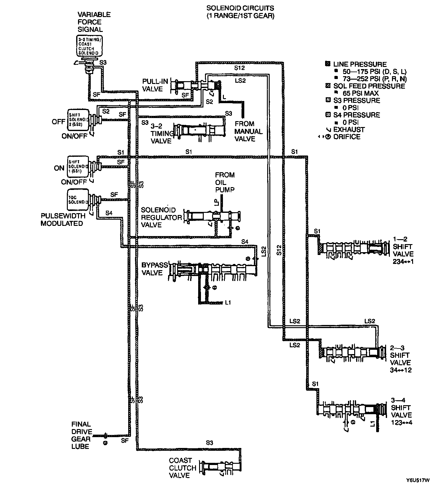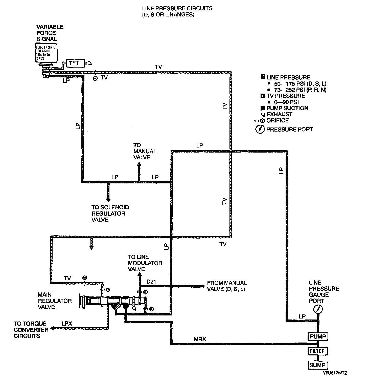 - In D, 2 or 1 ranges, the presence of fluid under line pressure in the D21 circuit at the main regulator valve causes line pressure to operate in a lower pressure range than in Park, Neutral and Reverse ranges. The absence of D21 circuit pressure in Park, Neutral, and Reverse ranges allows for a higher line pressure.