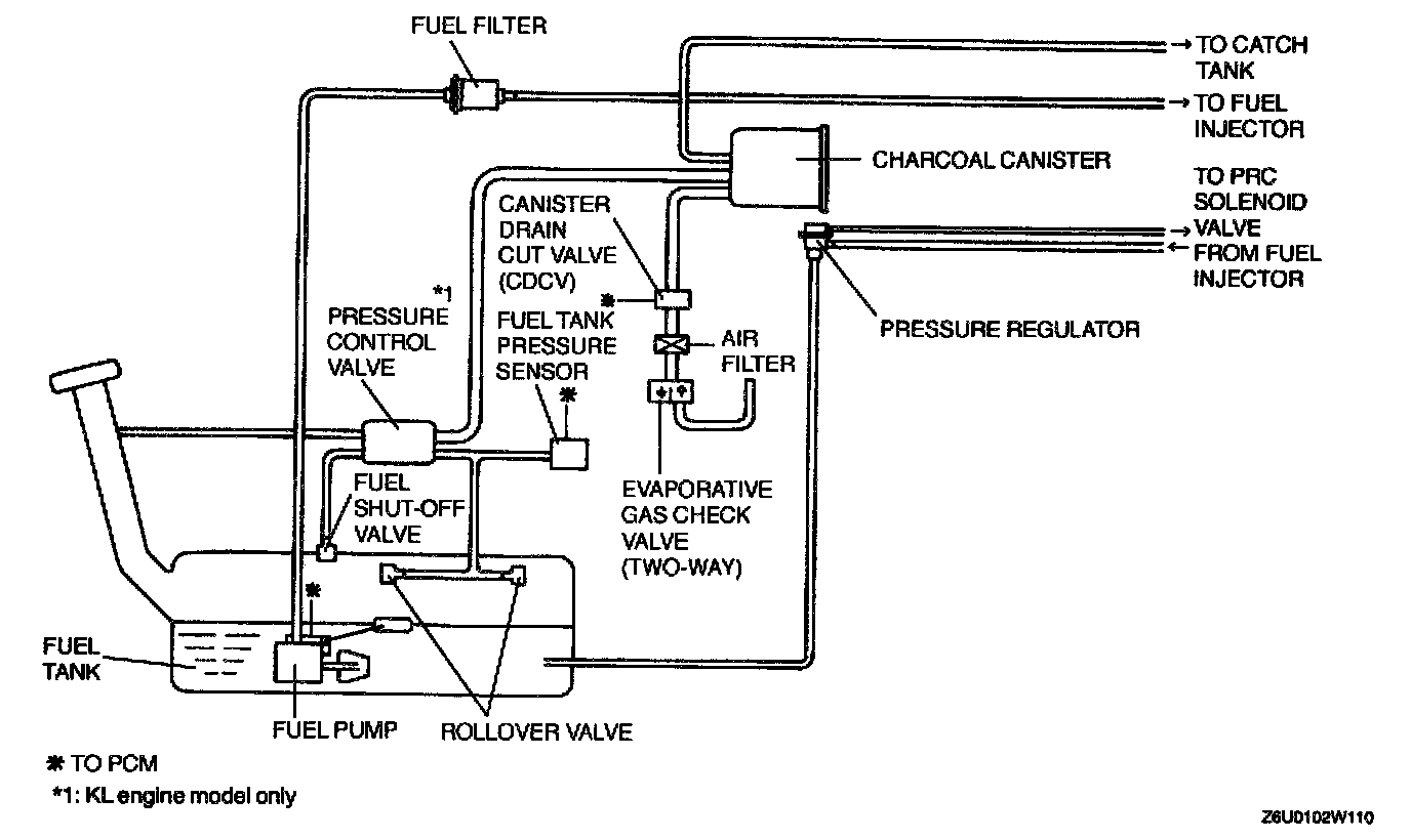 The EVAP control system prevents fuel vapor from releasing to the atmosphere and consists of the following: