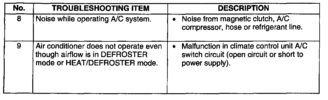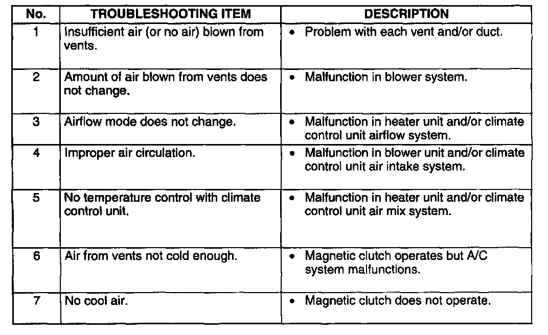 - The areas for inspection (steps) are given according to various circuit malfunctions. Use the chart below to verify the symptoms of the trouble in order to diagnose the appropriate area.