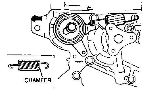 1. Install the tensioner spring so that the chamfer of dumping rubber faces the right side as shown.