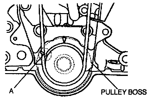 1. Install the pulley boss and pulley lock bolt. Turn the crankshaft clockwise 1 and 5/6 times, and verify that the timing mark and the tension set mark A are aligned.