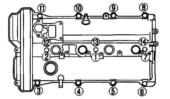 1. Tighten the cylinder head cover bolts in two or three steps in the order shown.