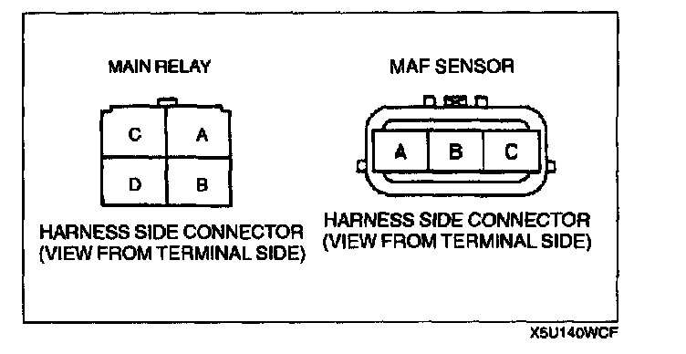 - MAF sensor connector terminal C and main relay terminal D through common connector to GND.
