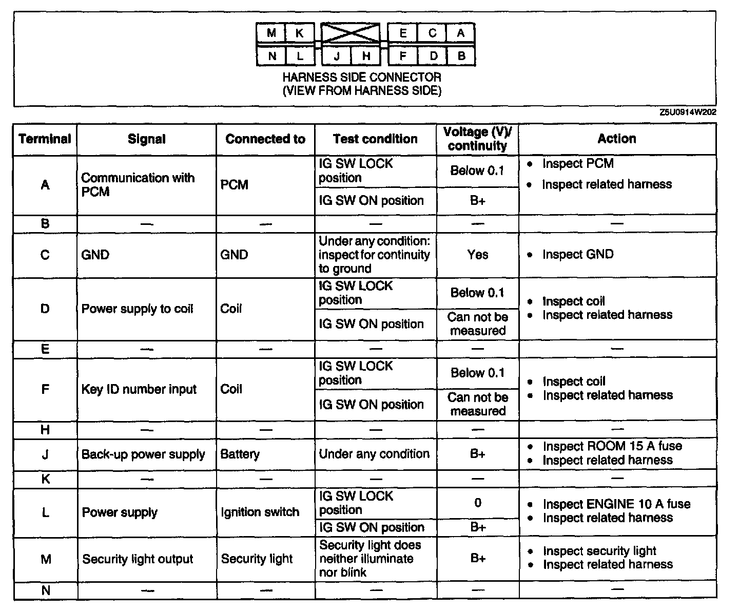 IMMOBILIZER UNIT INSPECTION1. Measure the voltage at the immobilizer unit terminals as indicated below.