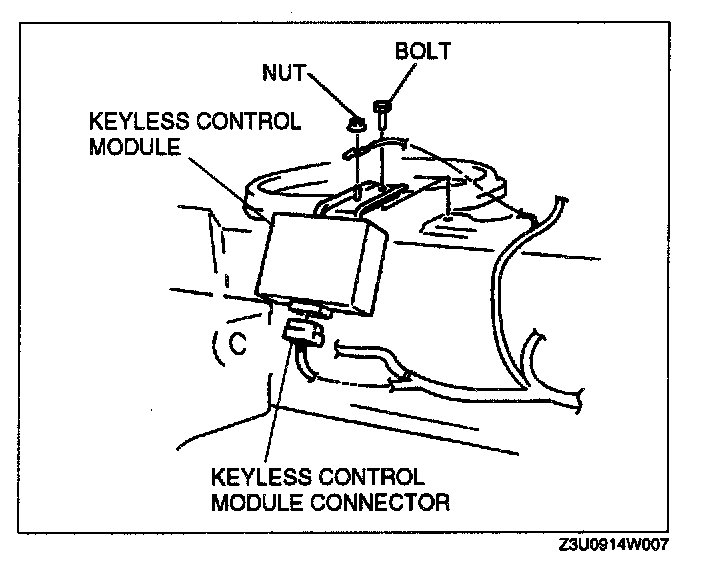 4. Remove the nut and bolt to remove the keyless - control module and the bracket as a unit.