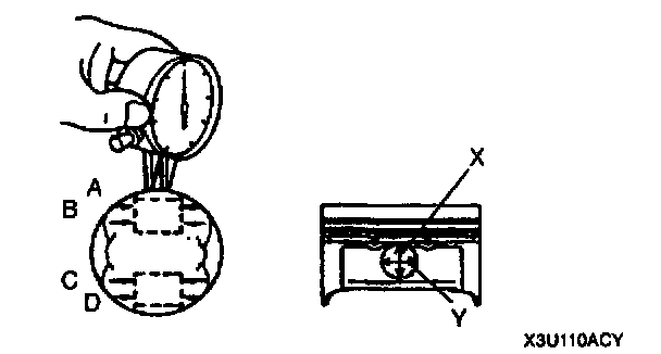 6. Measure each piston pin bore diameter in X and Y directions at the four points (A, B, C, and D) as shown.