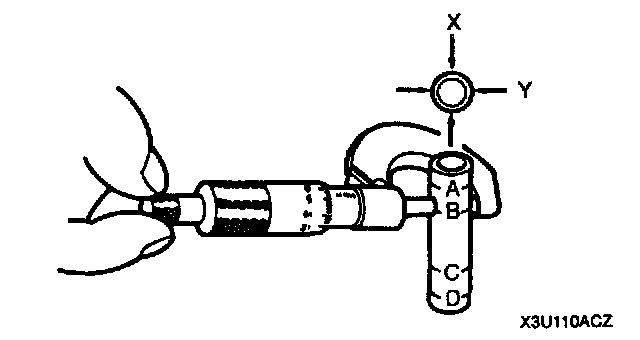 7. Measure each piston pin diameter in X and Y directions at the four points (A, B, C, and D) as shown.
