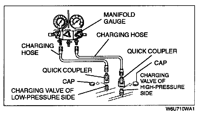 2. Connect the charging hoses to the high-pressure and low-pressure side joints of the manifold gauge.