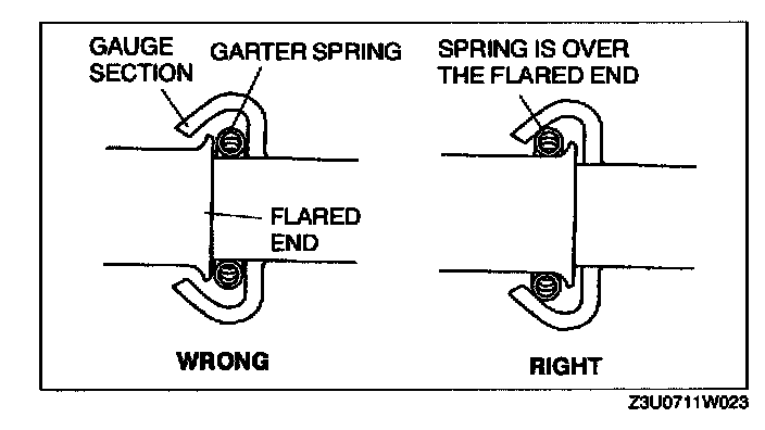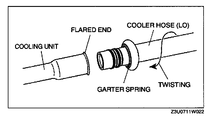 1. Connect the cooler hose (LO) by twisting it onto cooling unit until the garter spring at the cooler hose (LO) is over the flared end of cooling unit.
