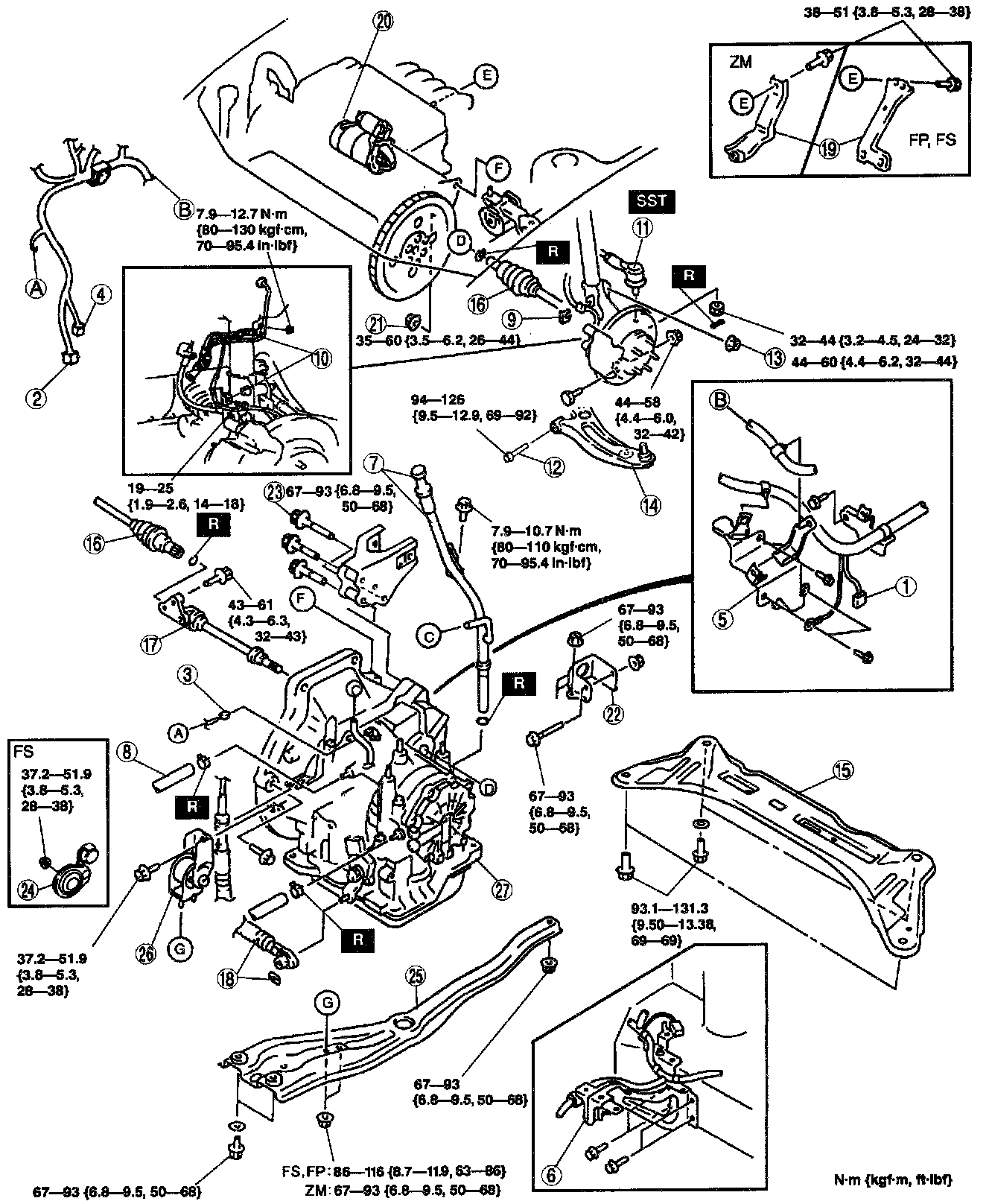 B (ZM): 67 - 93 Nm (6.8 - 9.5 kgf-m, 50 - 68 ft. lbs.)