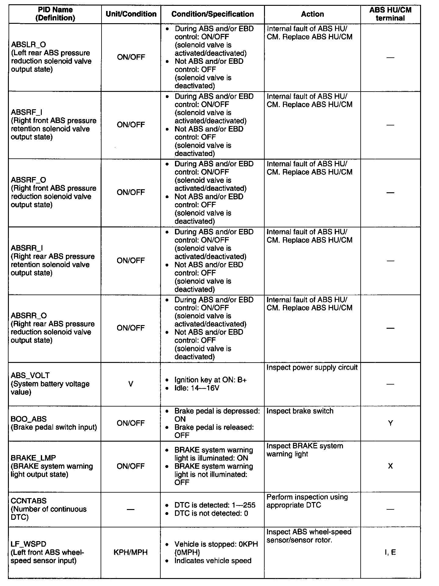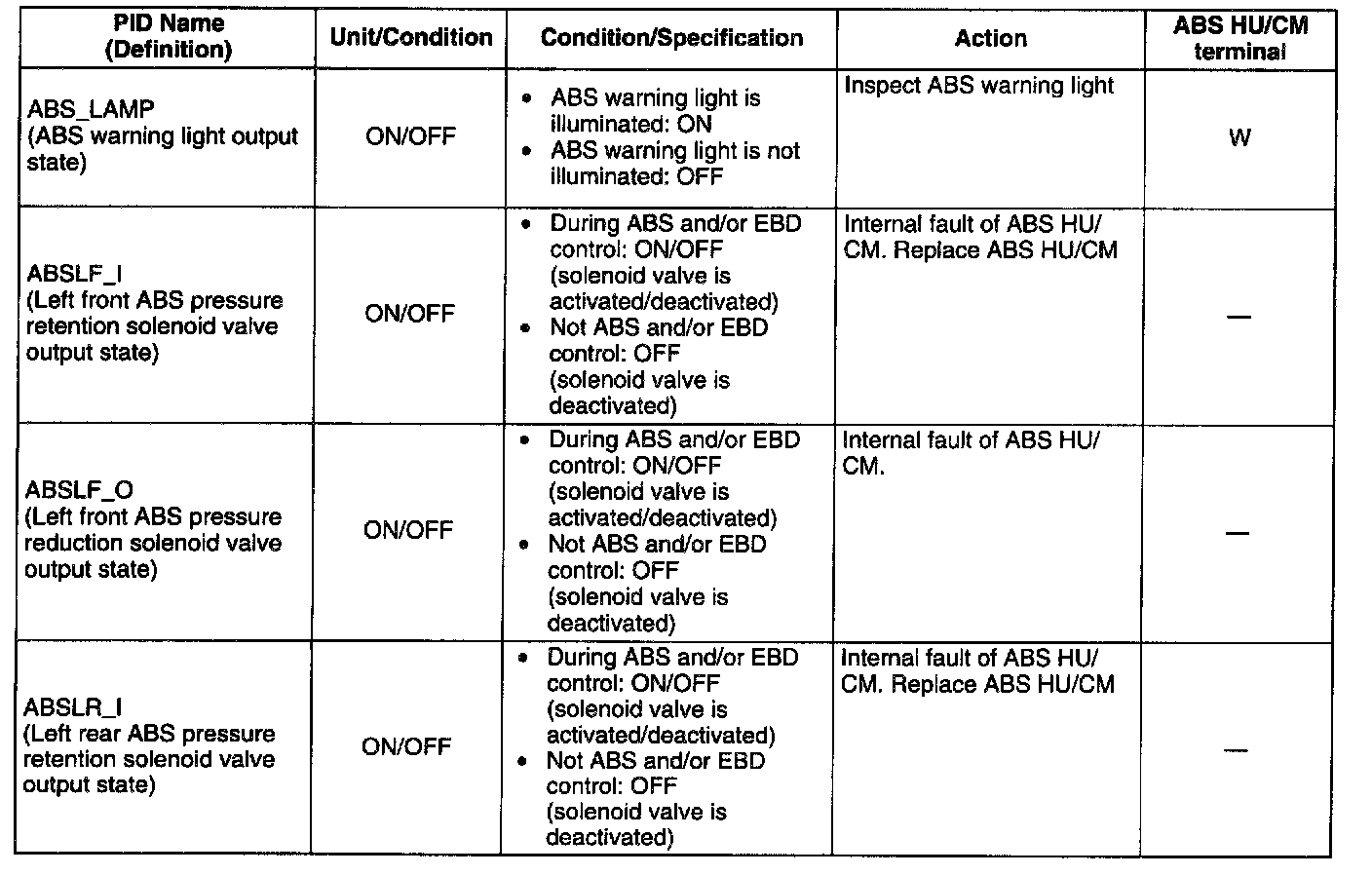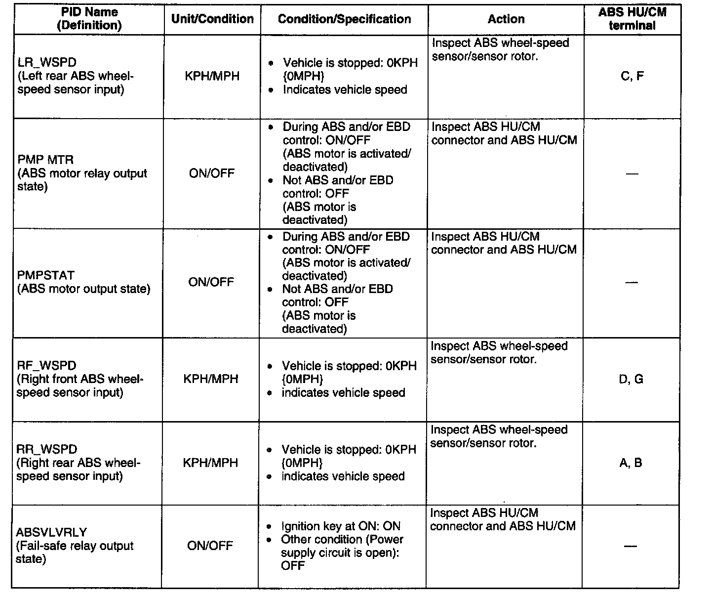 PID/DATA MONITOR TABLE
