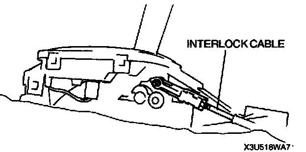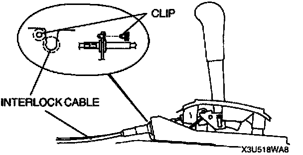8. Fit the interlock cable in the U-groove in the selector lever base plate, and install the clip.