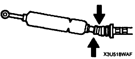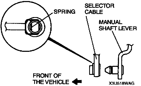 ^ Install the selector cable to the manual shaft lever with the spring side of the selector cable end facing the front of the vehicle.