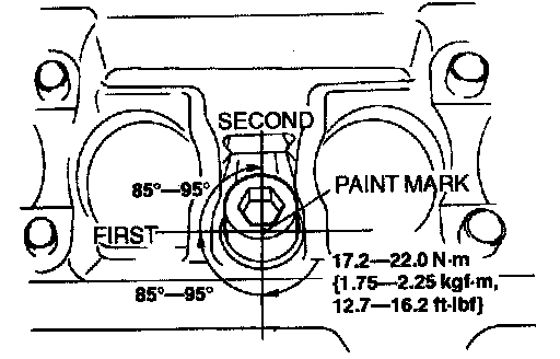 4. Using the marks as a reference, tighten the bolts by turning each 85°- 95° in the sequence shown.