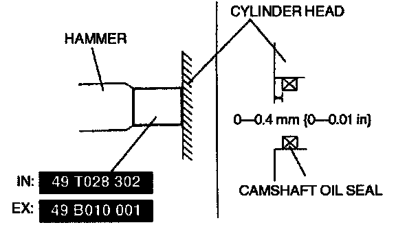 Because there is little camshaft thrust clearance, the camshaft must be held horizontally while it is installed. Otherwise, excessive force will be applied to the thrust area, causing a burr on the thrust receiving area of the cylinder head journal. To avoid this, the following procedure must be observed.