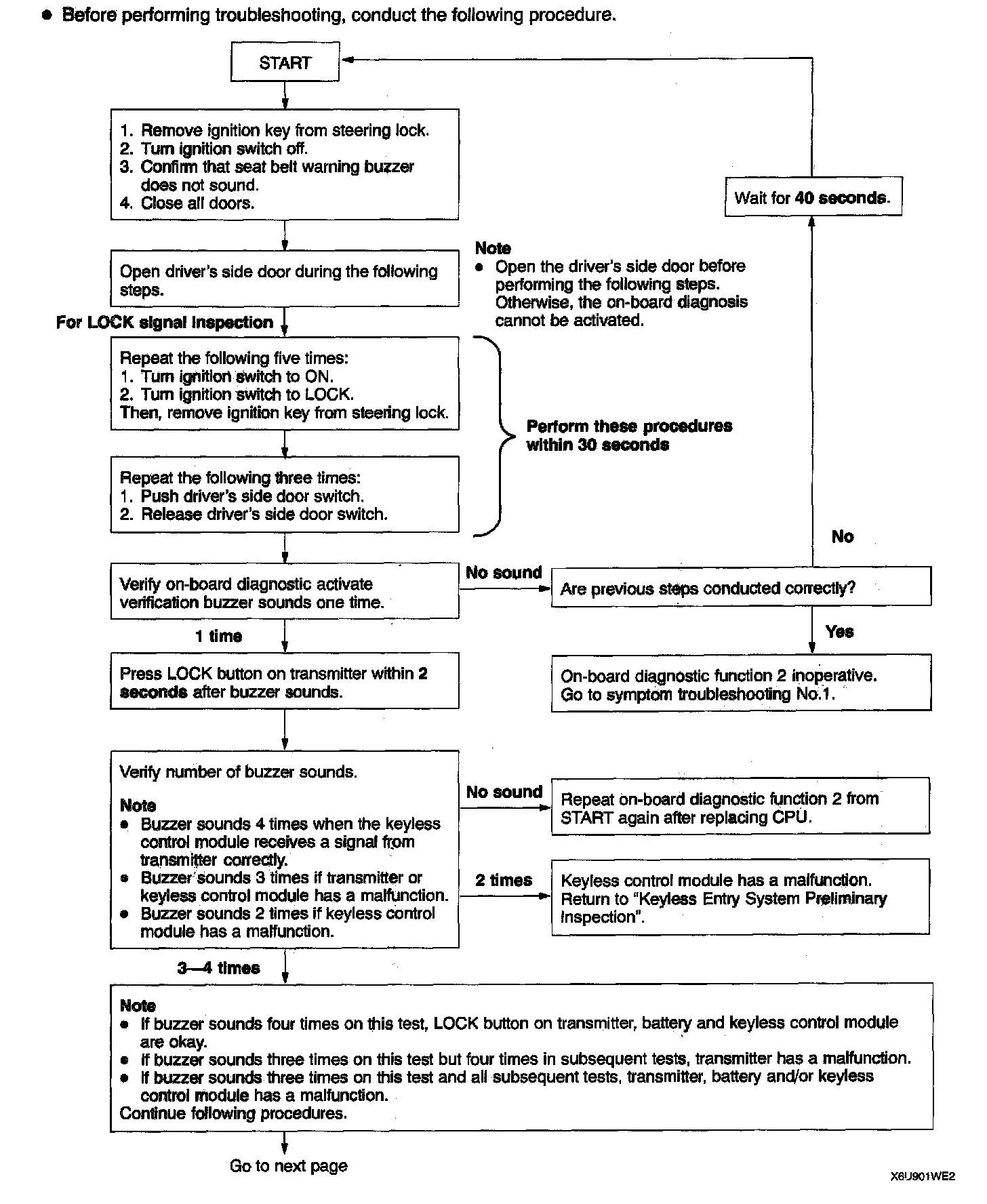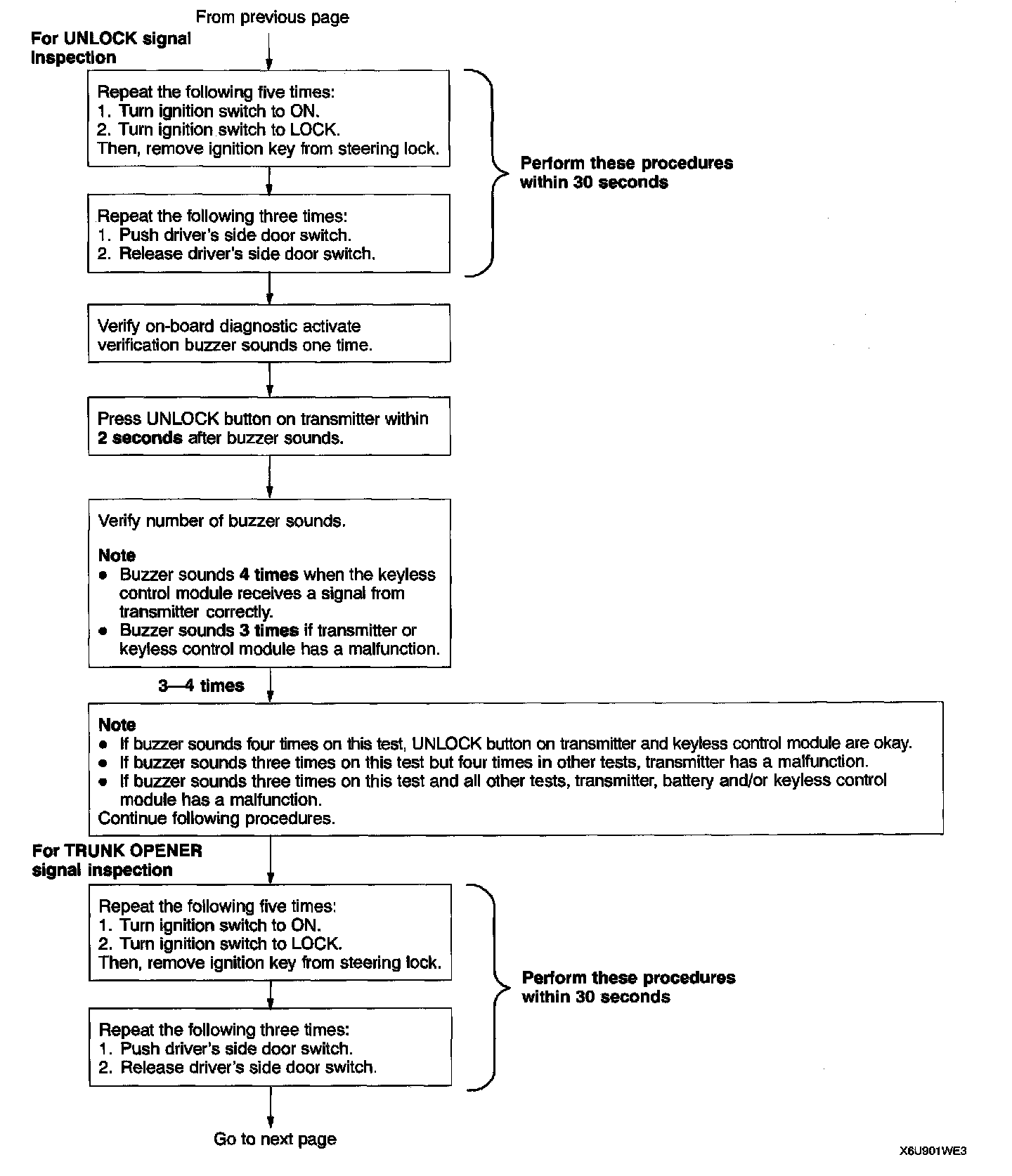 KEYLESS ENTRY SYSTEM ON-BOARD DIAGNOSTICThere are two functions for the keyless entry system on-board diagnostic (OBD). OBD function 1 tells the keyless control module and CPU to activate the power door lock and trunk lid opener systems without the transmitter. OBD function 2 monitors a keyless entry demand signal sent from the transmitter and used inside the keyless control module. OBD function 2 diagnoses the transmitter, integrated antenna and the keyless control module.